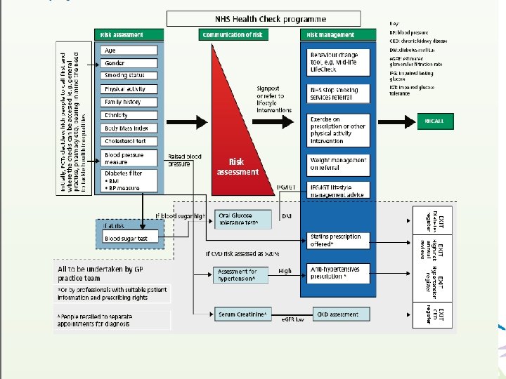 Health Checks The NHS Health Checks programme aims to prevent heart disease, stroke, diabetes and kidney disease Everyone between the ages of 40 and 74, who has not already been diagnosed with one of these conditions, will be invited (once every five years) to have a check to assess their risk of developing these illnesses and will be given support and advice to help them reduce or manage that risk Using a comprehensive approach; • Inform and support people to make healthier and more responsible choices • Creating an environment in which the healthier and more responsible choice is the easier choice • Identifying, advising and treating those at risk