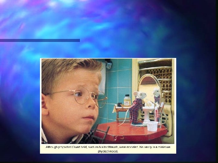 Stuart Little 500 shots with digital character n 6 main challenges n – Lip sync – Match-move (CG to live-action) – Fur – Clothes – Animation tools – Rendering, lighting, compositing