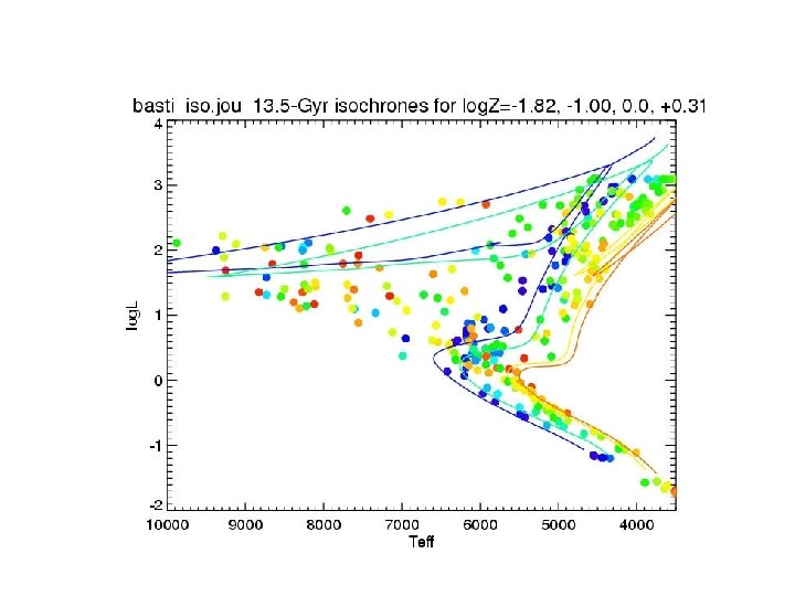 The spread in Teff increases with lower metallicities Isochrone log g [Fe/H]=0 [Fe/H]=-1. 01 [a/Fe]=0. 3 Teff V-R isochrones