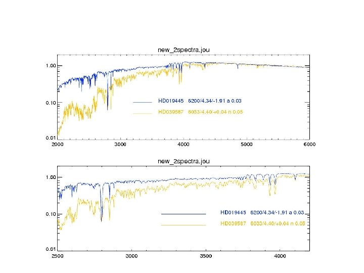 Next Generation Spectral Library HD 16031 HD 2665 (G 5 IIIw) Teff=5004 Teff log g=2. 27 log. ZZ= -1. 96 ELODIE log g log 6341 6114 FEATURES 4. 19 4. 07 -1. 12 (this study) -1. 79 (Clem et al. 2004) BENEFITS Wide l coverage: 0. 2 -1. 0 m Define new spectral indices; get wide-baseline SED, colors Absolute flux calibration Do wide-band spectrophotometry; measure spectral breaks Moderate spectral resolution Measure spectral indices, Check model spectra Large number of program stars: 378 312 are good observations 248 have good fits to their spectra Trace systematic trends of spectral indices