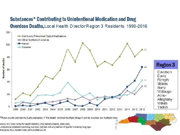 Unintentional Medication & Drug Deaths by County per 100, 000 North Carolina Residents, 2012 -2016 Source: Deaths-N. C. State Center for Health Statistics, Vital Statistics, 2012 -2016, Unintentional medication and drug overdose: X 40 -X 44/Population-National Center for Health Statistics, 2012 -2016 Analysis by Injury Epidemiology and Surveillance Unit