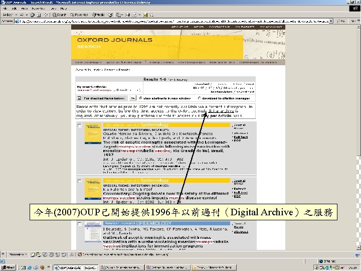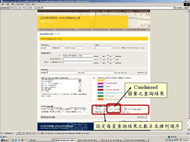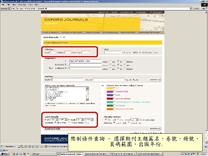 Making the most of Oxford Journals This demonstration will help you make the most of some of the features and functionality of the service to find and track your research: 旨在引導您充分利用牛津大學‧電子全文期刊服務之內涵特性、功能 以符合您研究之需求。 1. Searching Oxford Journals and expanding your search 牛津電子期刊之一般檢索要領及延伸領域之查詢 2. Monitoring specific subject areas 探究專門學術領域主題 3. Content alerting 論文引用通報與新刊目次內涵通報服務