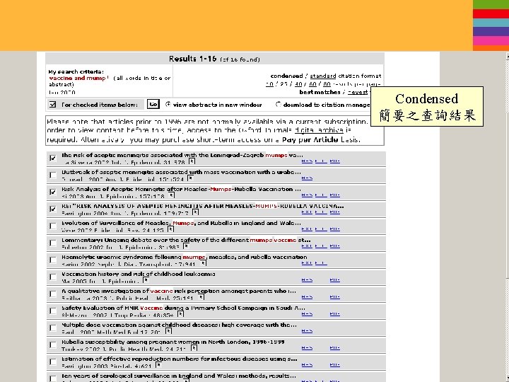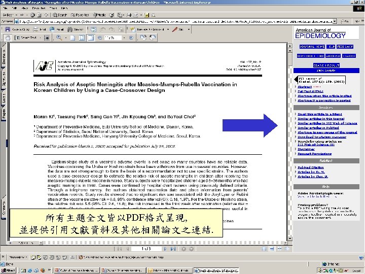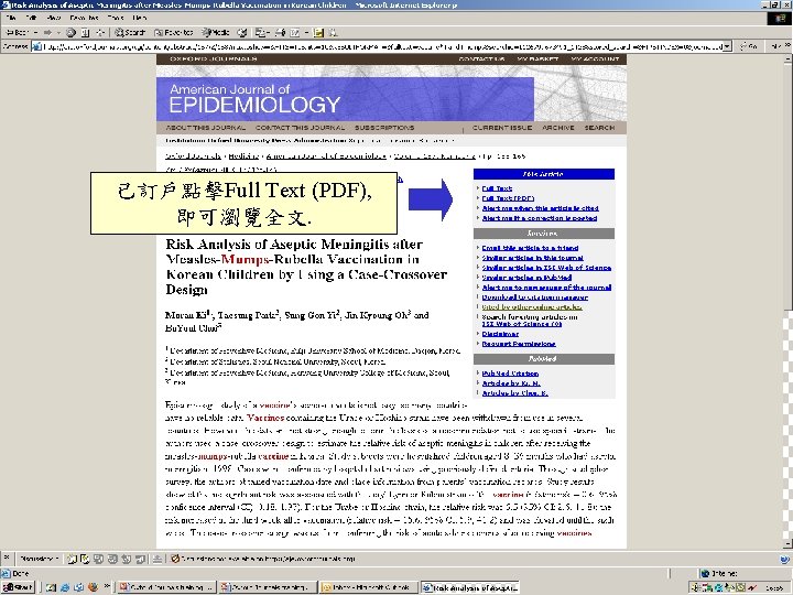 Toll-free Interjournal linking 其他免費期刊全文之連結 You can also follow our toll free links back in time : 及時獲取免付費參考文獻 • References link to articles from other journals hosted by High. Wire Press - which you can view at no extra cost (每一主題皆有其參照References連結至High. Wire Press 4500種期刊裡相關 之摘要、及其中 862種免費期刊裡頭相關之全文,讀者不必再付訂費。) • References are linked to ISI, Pub. Med abstracts and to other journals via Crossref (同樣的,每一主題亦有其參照References連結至ISI Web of Science、 PUBMed之索摘及透過Crossref 連結至其他期刊摘要,讀者不必再付訂費。)