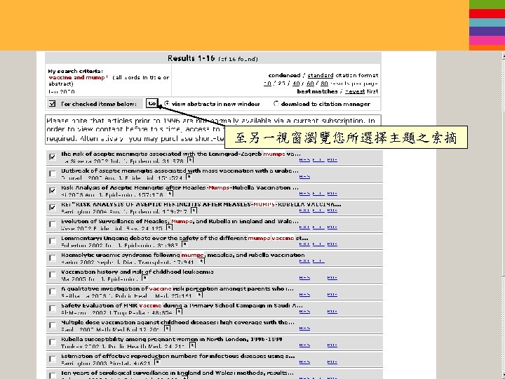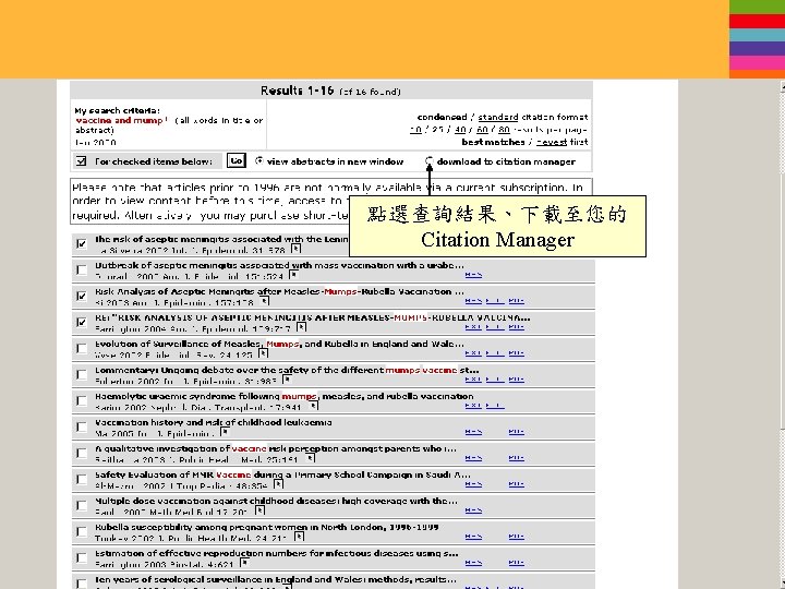 PDA downloads - PDA訊息通報服務 What is it? • 允許於PDA下載To. C and abstract information, 以便PDA users能於PDA 瀏覽新刊目次內涵. Why? • 此項新的服務功能讓您於遠離桌面時亦能及時掌握最新之研究資訊. When? • Launching June 2005 now for first 7 participating journals. 目前已有七種期刊加入此項服務.