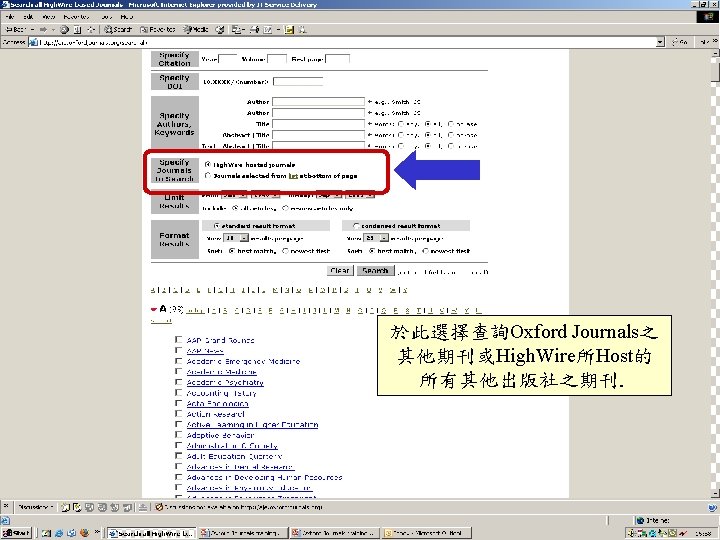 Searching Oxford Journals 1. 牛津電子期刊之一般檢索要領及延伸領域之查詢 This module will introduce you to: 三項檢索模式 • Searching Oxford Journals (檢索牛津大學電子全文期刊) • Boolean Search Arguments (使用布林邏輯參數查詢) • Search High. Wire + other databases (查詢High. Wire Press-hosted之4500種期刊、862種免費全文期刊 及其他重要相關期刊資料庫)