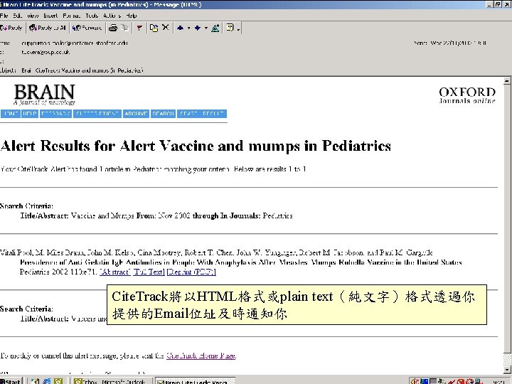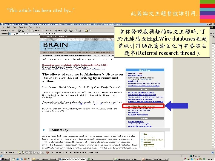 Monitoring specific topics 2. 探究專門學術領域主題 除了一般檢索功能之外, Oxford Journals Online 亦具如下三項 功能提供您做進一步之探索︰ “This article has been cited by. . ” 此篇論文主題曾被誰引用. . Cite. Track - alerts tailored to your chosen criteria 論文引用通報 (*可自訂感興趣之論文) Other toll-free inter-journal links 其他免費期刊全文之連結