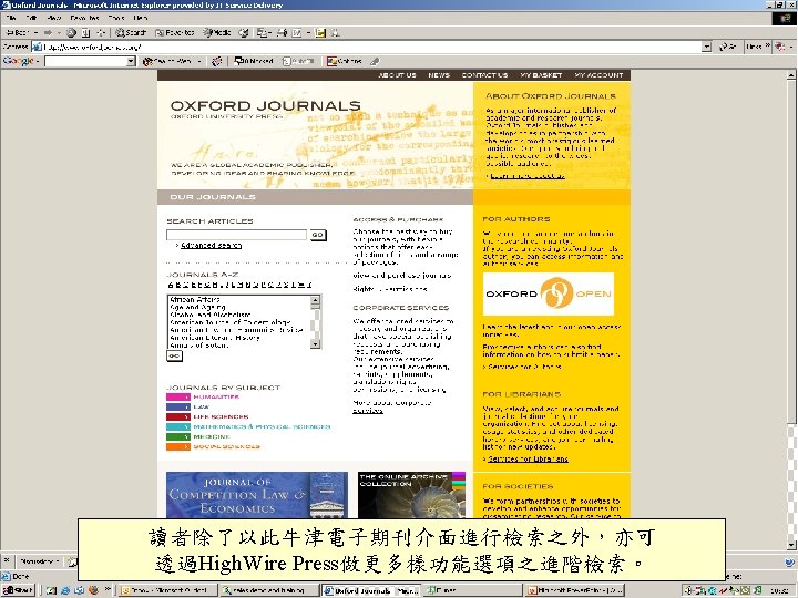 於首頁(www. oupjournals. org) (Journals A-Z)或(Journals By Subject) 即可容易瀏覽 180種牛津電子期刊