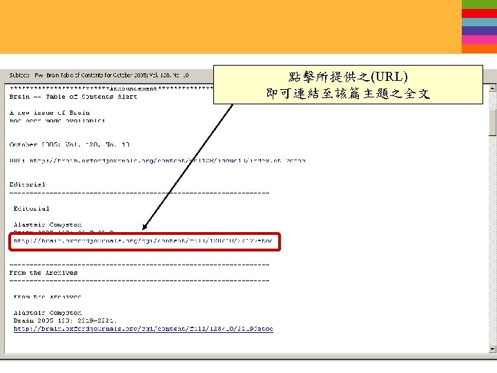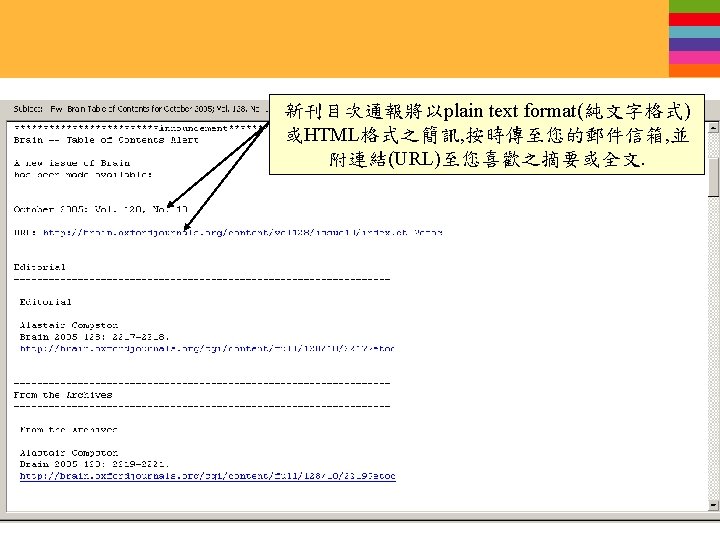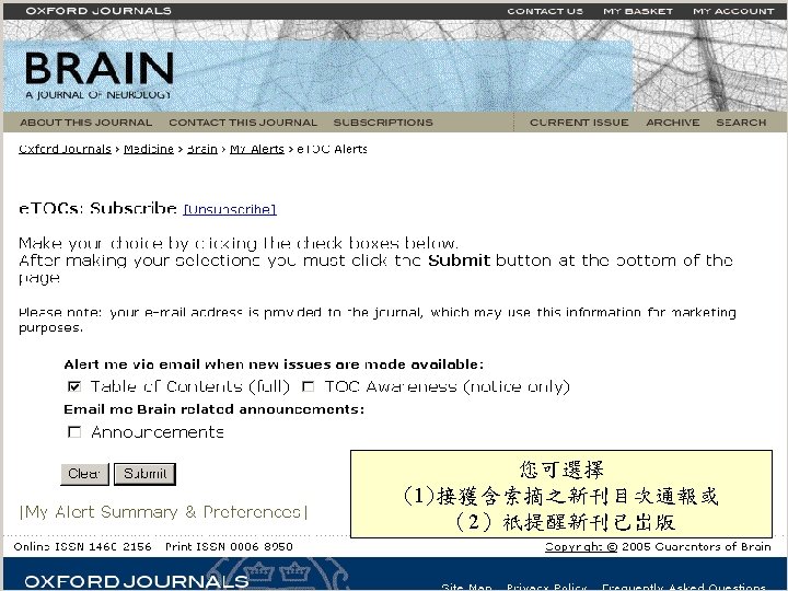 Content Alerting (新知通報服務 ) Oxford Journals provide a range of services to bring your selected research to you in a timely manner: 一系列新知通報服務,確實掌握最新學術研究訊息 • E-Toc Alerts – table of contents (電子期刊系統最新目次通知服務) • Regular issue content (定期通報新刊目次內涵) • Publish-ahead-of print content (紙版發行前數週,電子版先行出刊) • RSS Feed (RSS線上訊息通報服務) • PDA Alerts (屬於自己的PDA訊息通報服務)