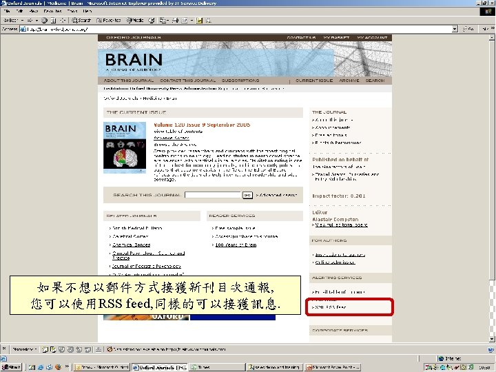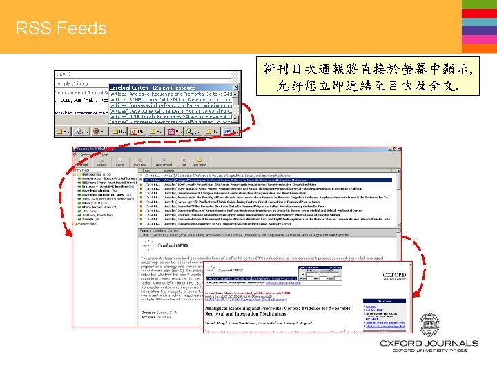 RSS Feeds 簡易新聞供稿系統 What is it? RSS (“Really Simple Syndication”) is an established technology for providing up-to-date newsfeeds from web sites to end users and other websites. 訂閱簡易新聞供稿系統 Each journal offers an RSS feed of the latest TOC information, providing RSS users with a convenient alternative to e-mail TOCs 每一期刊出版商, 皆以簡易新聞供稿系統(RSS Feed)方式, 提供讀者 取代郵件方式, 直接由網頁存取新刊目次通報(TOCs) Two feeds are available: Oxford Journals提供兩種RSS Feeds 1. RSS feed of current issue (現刊) 2. RSS feed of recent issues (covers the latest 3 issues, including the current issue) (現刊,包含最近兩期過刊)