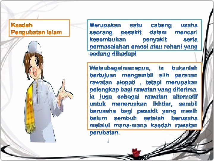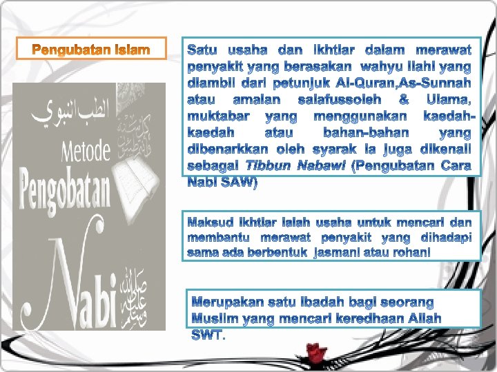 Kesimpulan Kaedah pengubatan Islam merupakan ikhtiar untuk mengubati penyakit dengan menggunakan ayat-ayat al-quran, hadis, ijmak ulama’ dan qias. Disamping itu Pengubatan Islam juga menggunakan bahan atau herba yang telah dibacakan ruqyah yang dibenarkan oleh syarak dan menjaga batas syariat yang telah ditetapkan oleh agama. Pengubatan Islam adalah berasakan kepada pengubatan yang berpandukan kaedah Nabi saw.