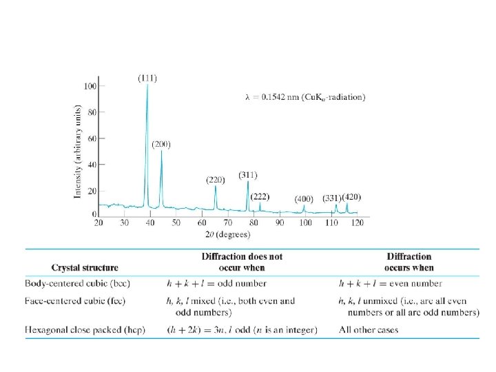 • Bu piklerin oluşumunun gerçekleştiği açılarda yansıyan ışın demetleri aynı fazda olur ve bu durum “Bragg kuralı” nın sağlanması anlamına gelir. • : gelen ışının dalga boyu. • d: düzlemler arası mesafe. • : gelen ışın – düzlem arası açı. • 2 : brag açısı. • h, k, l: düzlemin miller indisleri. Yani piklerin oluştuğu brag açıları ölçüm yapılan kristal malzemenin belli atom düzlemelerini “d” düzlemler arası mesafe parametresi yardımı ile ifade eder.