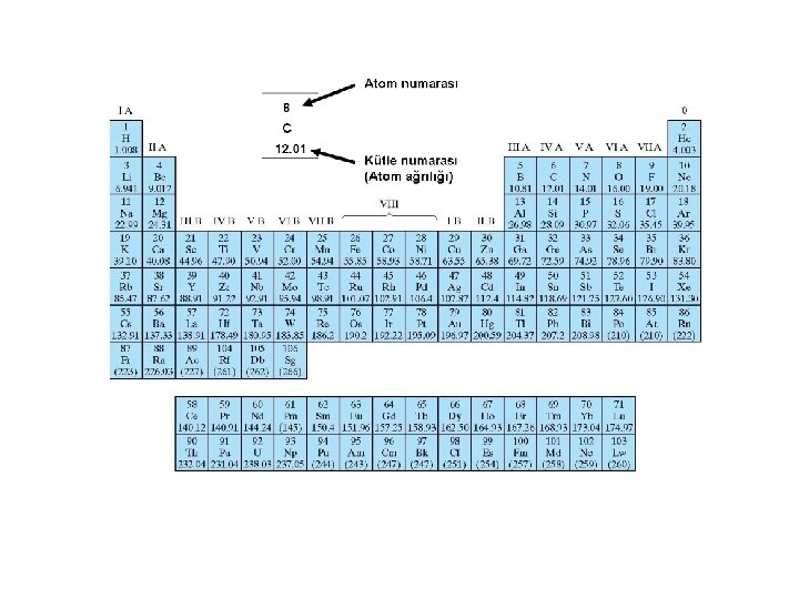 • • • Proton ağırlığı = nötron ağırlığı Proton sayısı = elektron sayısı “İzotop”: proton sayısı ≠ nötron sayısı. Atom numarası = proton sayısı Atomsal kütle birimi = proton ağırlığı = 1 amu = 1, 66 x 10 -24 g. • Avagadro sayısı = 6. 023 x 10 -23. • 1 gr = 6. 023 x 10 -23 amu. (1 / 1. 66 x 10 -24) dur.