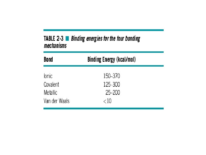 • Bağ kuvveti ve enerjisi iyonik ve kovalent bağlarda benzesede iyonik bağa ait denklemler uygulanamaz. Şekil 2 -18: Bağ Enerjisi eğrisi: Bütün bağ çeşitleri için geçerli. Tablo 2 -2: Kovalent bağlar için bağ enerjisi-bağ uzunluğu değerleri. Bağ uzunluğu ile enerji lineer değil.
