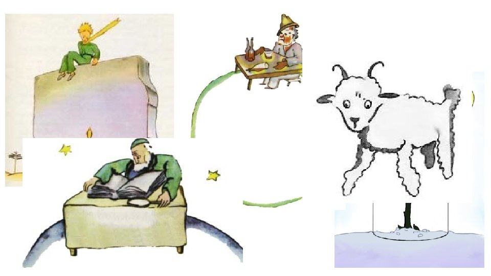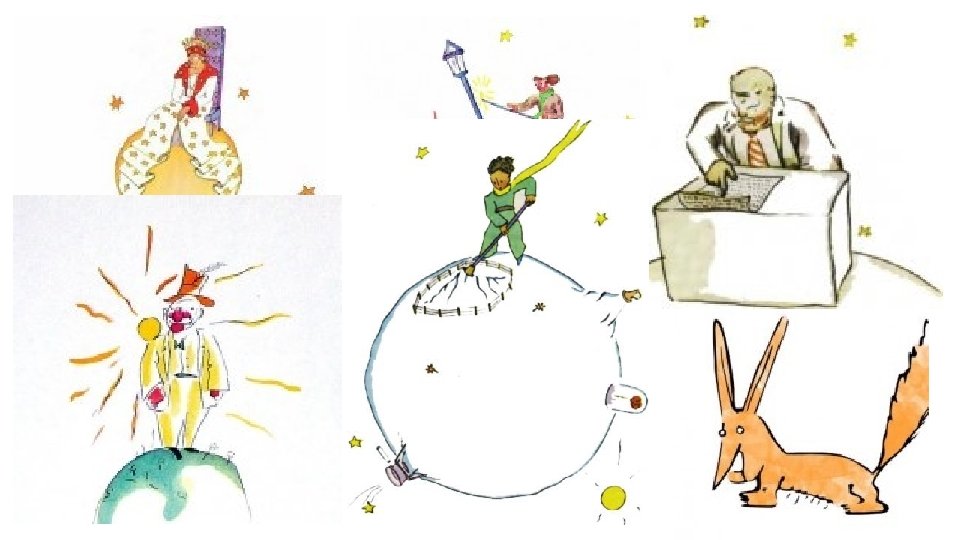 Malý princ VEDĽAJŠIE POSTAVY: » kráľ – žil na prvom asteroide a každému chcel rozkazovať » márnivec – žil na druhom asteroide a miloval, keď ho ľudia obdivovali, bol veľmi samoľúby » pijan – obýval tretí asteroid, pil, pretože sa hanbil za to, že pije » biznismen – obyvateľ štvrtého asteroidu, len počítal svoje hviezdy a o nič iné sa nezaujímal » lampár – mal svoj asteroid, v poradí piaty, kde stále zhasínal a rozsvecoval svoju lampu