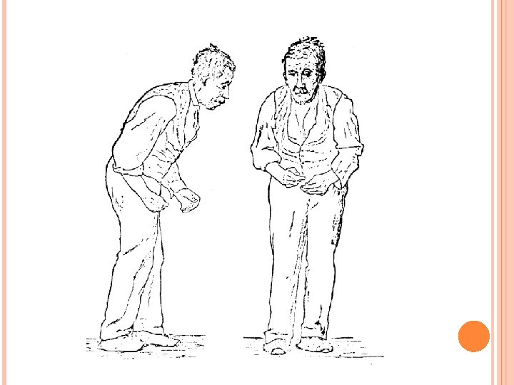 SIGNES CLINIQUES Tremblement : de repos, lent, régulier, prédominant aux extrémités, touchant la bouche et le menton, disparaissant lors des mouvement volontaires, aggravé par l’émotion. Akinésie ou hypokinésie touche : Marche et les mouvements (lenteur et rareté du mouvement). Le patient semble limiter constamment ses gestes. La parole : dysarthrie monotone La face : amimie L’écriture : micrographie Rigidité ou Hypertonie : Plastique : « roue dentée » , responsable de l’attitude générale en flexion Autres signes : trouble végétatif → Hypotension orthostatique →accès de sudation → hypersialorrée (trop de salive) →aspect luisant du visage → Hypersécrétion sébacé reflexe tendineux sont normaux , Réflexe naso-palpébral vif et inépuisable. Pas de déficit moteur ou sensitif limitation des mouvements oculaires → Sur la convergence → Sur le regard en haut modification de l’état psychique, souvent au début état dépressif, mais intellect conservé