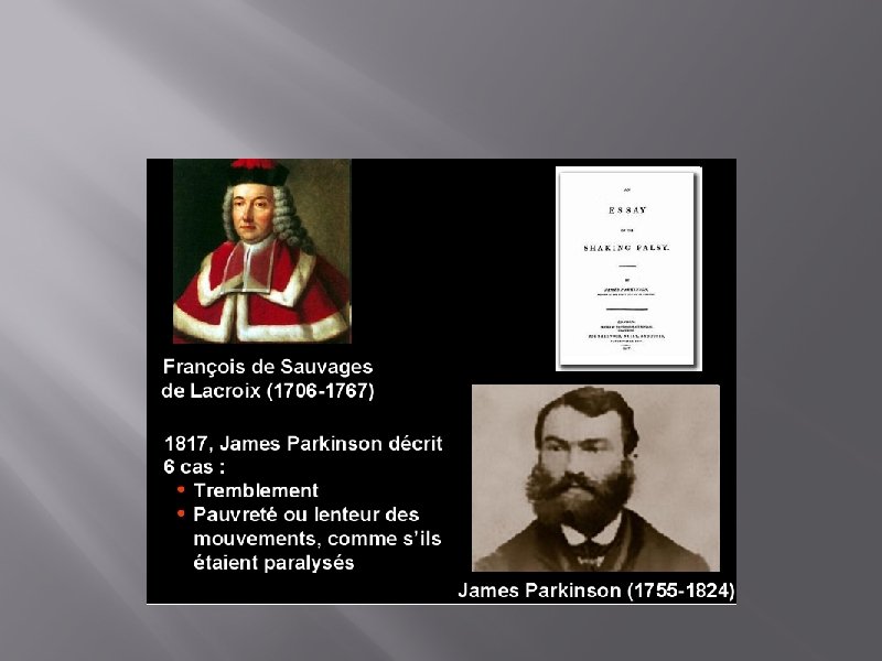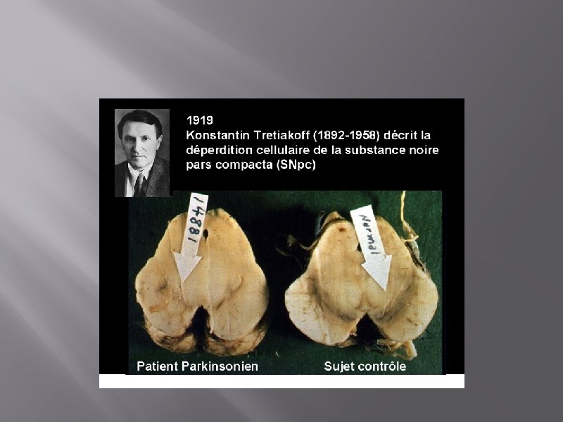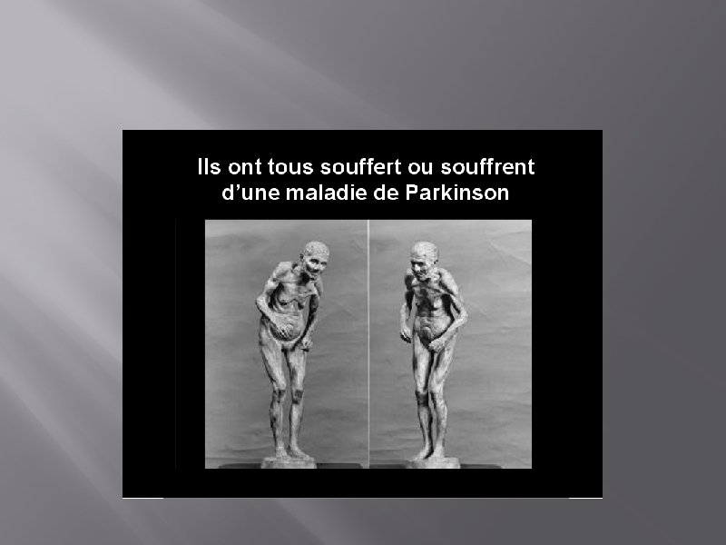 EPIDEMIOLOGIE • • 10 à 20 cas pour 100. 000 habitants 1 pour cent des sujets plus de 60 ans Début entre 40 et 70 ans (58/62 ans). maladie degenerative responsable de troubles moteurs(2 eme aprés les pathologie cérébro-vasculaire).