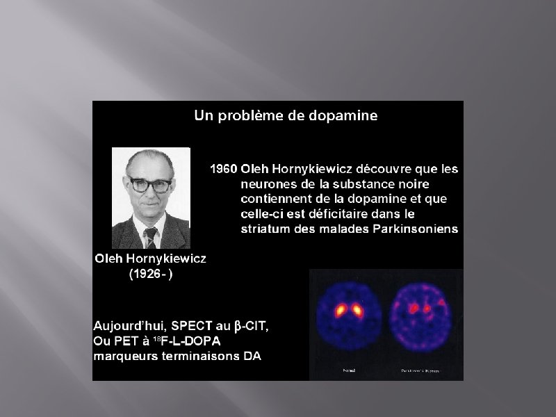 Traitement médical � � Symptomatique/ médicaments dopaminergiques (n’agissent ni sur la progression de la maladie ni sur la cause) But: restaurer la transmission dopaminergique striatale: � En le taux de la dopa (administration de son précurseur la L-dopa associée à l’inhibiteur de la dopa décarboxylase périphérique) � En stimulant les récepteurs directement / agonistes dopaminergiques � En la dégradation de la dopamine par l’utilisation d’inhibiteurs enzymatiques de la MAO bêta ou de la catécol-o-méthyl-transferase (COMT)