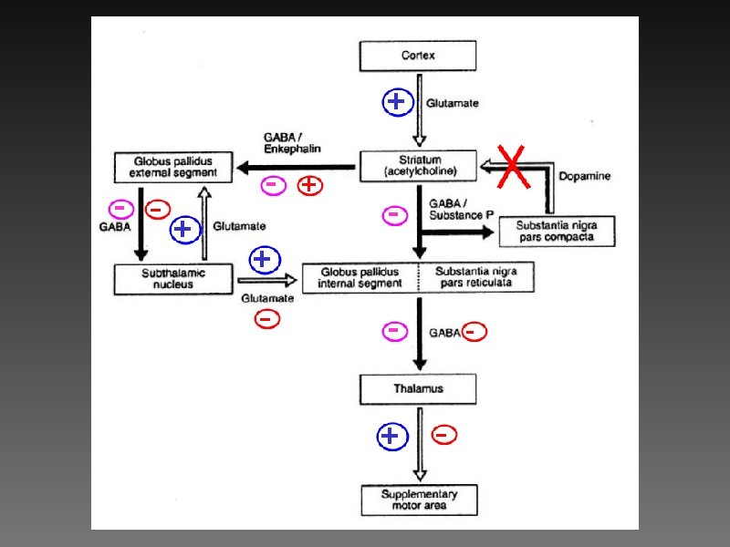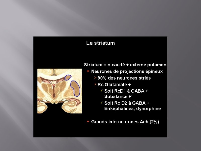 � � � Le système extrapyramidal: striatum (putamen + noyau caudé), pallidum, locus niger (LN), thalamus (noyau antérieur et ventro-latéral) et noyaux sousthalamiques (corps de Luys, noyau rouge…) joue un rôle majeur dans la régulation du mouvement volontaire. L’atteinte de la boucle dopaminergique nigro-striée. La diminution de la synthèse de dopamine au niveau du LN (ou le blocage des récepteurs) entraîne une levée de l’inhibition normalement exercée sur les neurones cholinergiques du striatum (par l’intermédiaire de neurones GABAergiques).