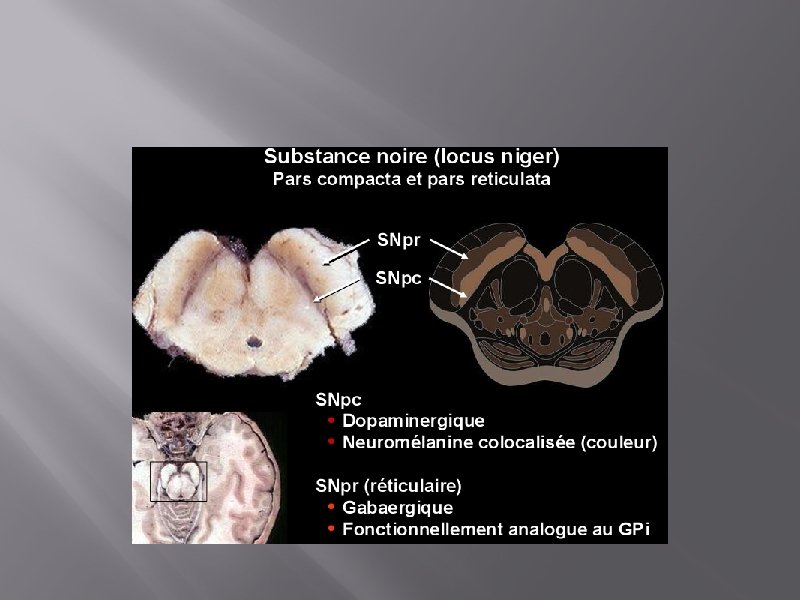 PHYSIOPATHOLOGIE Dégénérescence de la voie nigrostriatale (dopaminergique) • Raréfactions des terminaisons dopaminergiques striatales • Diminution de la concentration de dopamine dans le striatum et le locus niger • Augmentation de l’activité des neurones cholinergiques du striatum •