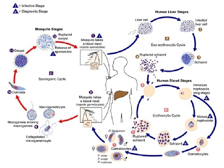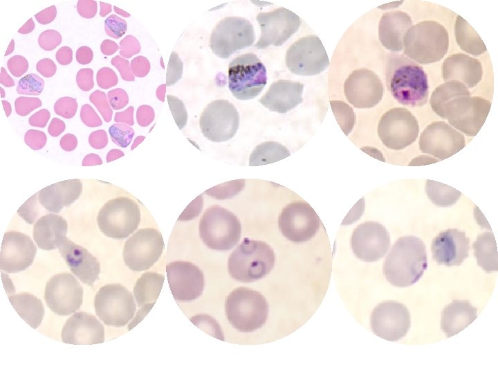Life cycle * The infected R. B. Cs. with P. vivax, after the appearance of the ring stage it characterized by the appearance of minute dots stains with red color or (reddish-orange) in Giemsa or right stained thin blood films called (Schüffner’s dots) or granules, also the R. B. C. appears swelling and paler; however, this dots appears also in the case of P. ovale, but in this case the infected R. B. C. becomes oval in shape (the cause of the name). In the case of P. falciparum appears reddish dots called (Maurer’s dots) this dots less in number and larger than the first type. In P. malariae appears other dots called (Ziemann’s dots).