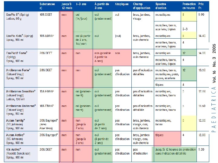 REPULSIFS CUTANES EN SUISSE Efficacité des anti moustiques en Suisse (ABE 2006) TRES EFFICACES (classé par prix croissant) Anti Insect Forte®-Migros Kik Activ® Anti Brumm® Forte Exopic 12® forte (6, 5. -CHF/100 ml) (8. 15. -CHF/100 ml) (8, 6. -CHF/100 ml) (14, 8. -CHF/100 ml) DEET 32% et du limonene DEET 18% (dès 3 ans) DEET 28% DEET 12% (dès 1 an) EFFICACES (NB: L’efficacité diminue avec la transpiration du sujet…) • Anti Brumm® Naturel • Autan® Active Pump Spray • Exopic 8® spray (9. 95. -CHF/100 ml) (12. 8. -CHF/100 ml) (14. 45. -CHF/100 ml) INEFFICACES Anti-Moustiques Phytopharma Mousti Fluid eau protectrice Dapis gel naturel (9, 95. -CHF/100 ml) (13. 2. -CHF/100 ml) (24. 5 -CHF/100 ml) PMD Bayrepel® 20% EBAP (IR 3535) 12%