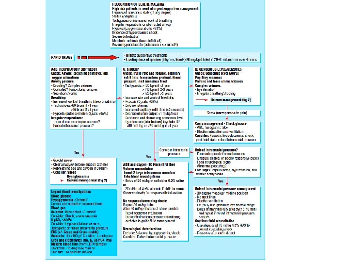 CRITERES DE SEVERITE BIOLOGIQUES • Hypoglycémie < 2, 2 mmol/L (RMS) • Anémie sévère (RMS, OMS, HAS) surtout à P. Vivax chez l’enfant • Hb < 50 g/l, Ht <15% • Plaquettes < 100 G/L • Acidose (RMS) • p. H < 7. 35 • BE < -10 • HCO 3 < 15 mmol/L • Lactates > 5 mmol/l (RMS) • Hyper-parasitémie (valeurs controversées) • > 2 -4% chez sujets non immmuns, en zone de transmission faible (OMS, Red. Book, AHA). • > 5 -20 % chez sujets semi-immuns en zone de forte transmission stable* (OMS, AHA) • Augmentation du risque de malaria sévère avec un OR de 1, 4 par tranche de 5% (AHA) • Dès 10% de parasitémie, il faut discuter d’une exsanguino-transfusion avec un spécialiste (Bâle). • Elévation des transaminases > x 3 la norme (HUG) ou bilirubine > 50 mcmol/L • Insuffisance rénale (RMS) surtout dans neuropaludisme • Diurèse < 12 cc/kg/24 h • Créatininémie qui reste augmentée après réhydratation • Forme parasitaire mature au frottis = schizontes (HUG) • Pigments d’hémozoïne dans > 5% des neutrophiles (HUG) * A noter que l’immunité baisse très vite déjà 12 -24 mois après avoir quitté la zone => un retour au pays est un facteur de risque surtout pour les petits enfants jamais immunisés ! Dès 1 critère de labo anormal , on traite comme une malaria sévère!