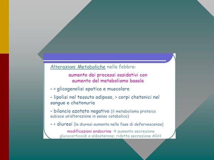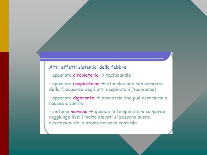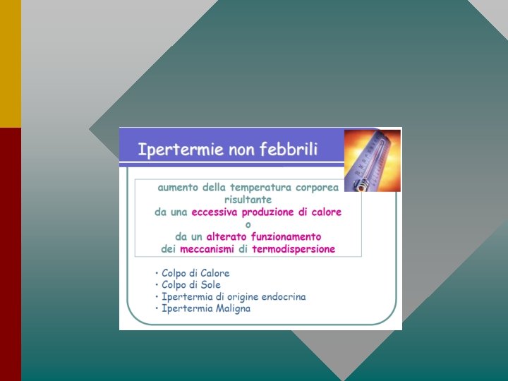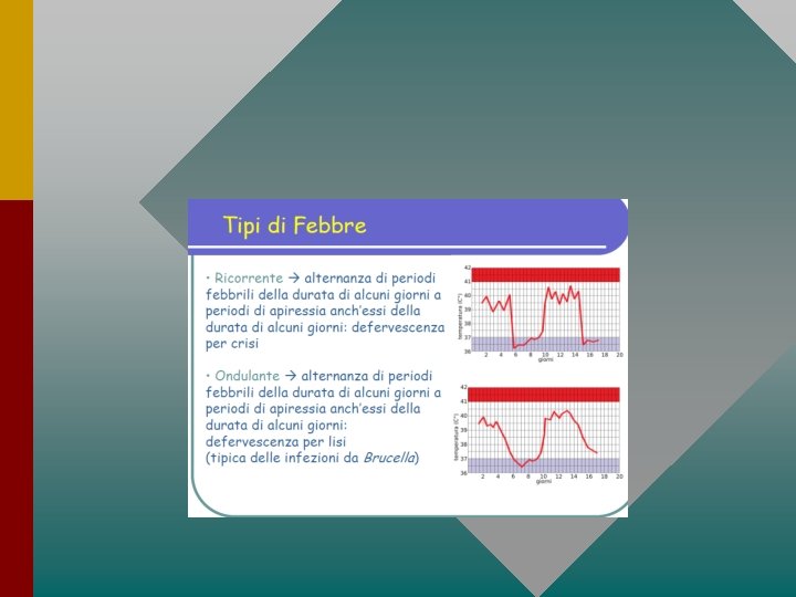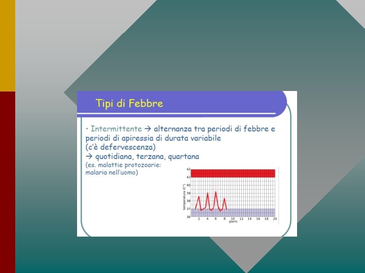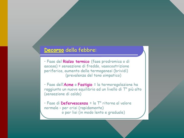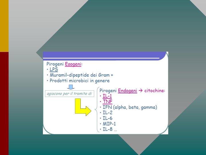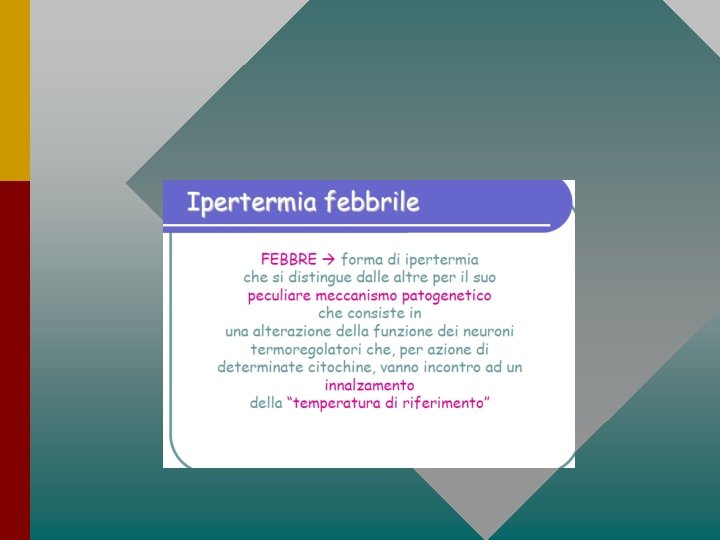 FEBBRE E’ una alterazione funzionale reversibile dei neuroni dei centri termoregolatori , consistente in una elevazione della temperatura di riferimento (per gli umani 37°) geneticamente prestabilita. E’causata da diverse citochine sintetizzate e rilasciate in eccesso da numerose cellule dell’organismo.