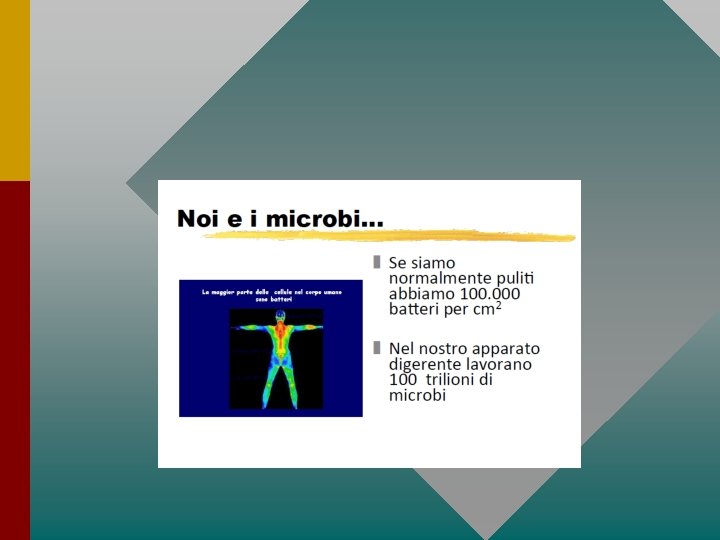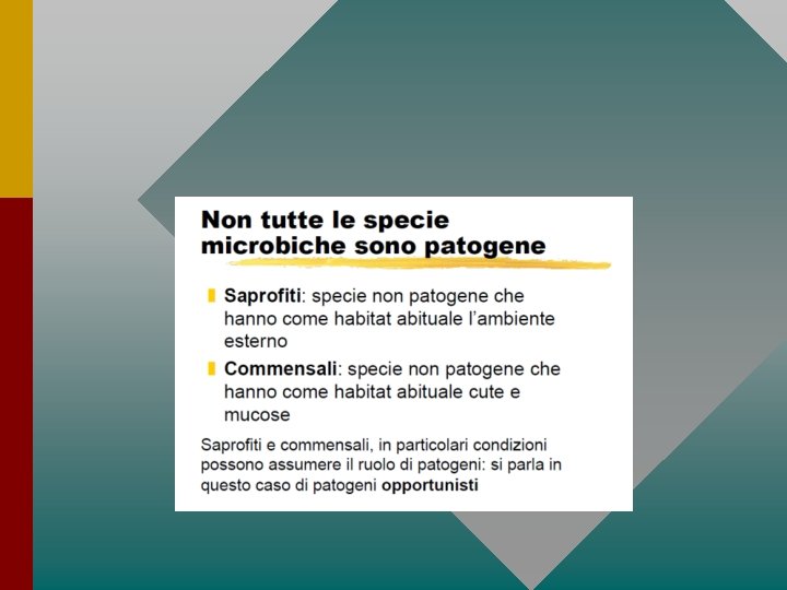 FLORA BATTERICA SAPROFITICA Molti microrganismi non patogeni vivono e si riproducono nel corpo umano in condizione di commensalismo o di mutualismo, competendo con i patogeni e fornendo in alcune sedi (intestino) all’organismo ospite alcune vitamine che non è in grado di sintetizzare