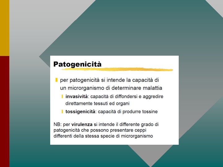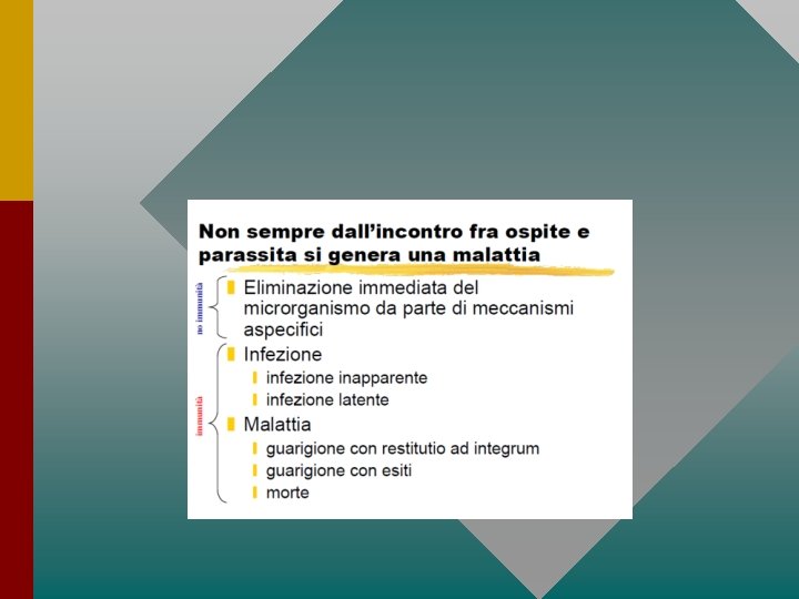 INFEZIONI - Parassitismo : dalla convivenza i microrganismi ricavano vantaggio e l’ospite danno - Commensalismo : il vantaggio riguarda solo uno dei due conviventi senza che l’altro ne sia danneggiato - Mutualismo : il vantaggio riguarda tutti e due i conviventi