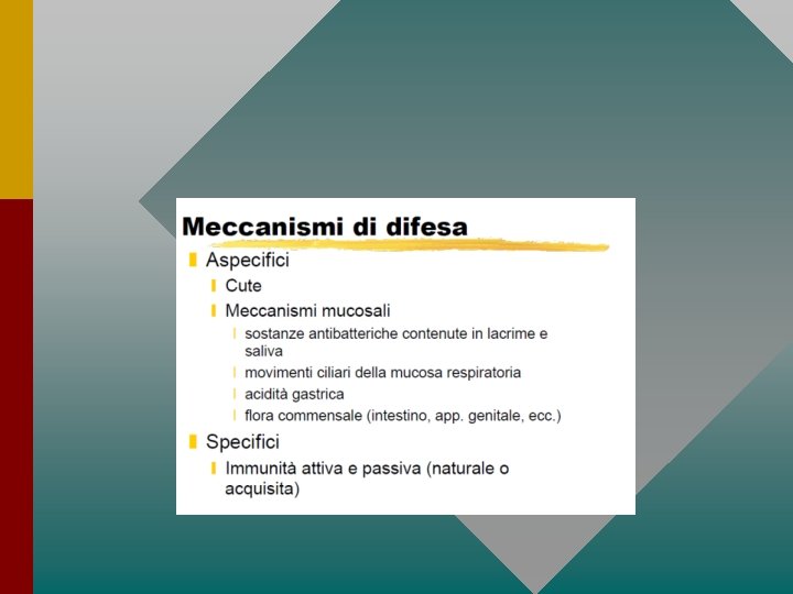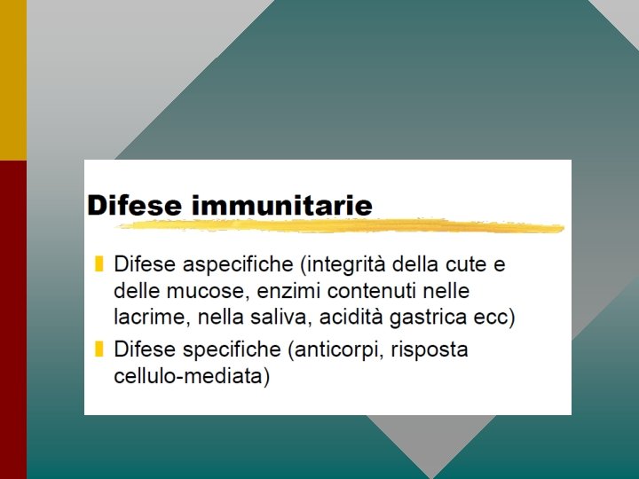 2 - IMMUNITÀ ASPECIFICA: • presente alla nascita • attiva verso tutti i microrganismi • indipendente da precedente contatto con lo stesso agente patogeno • non rafforzata da altri contatti con lo stesso agente