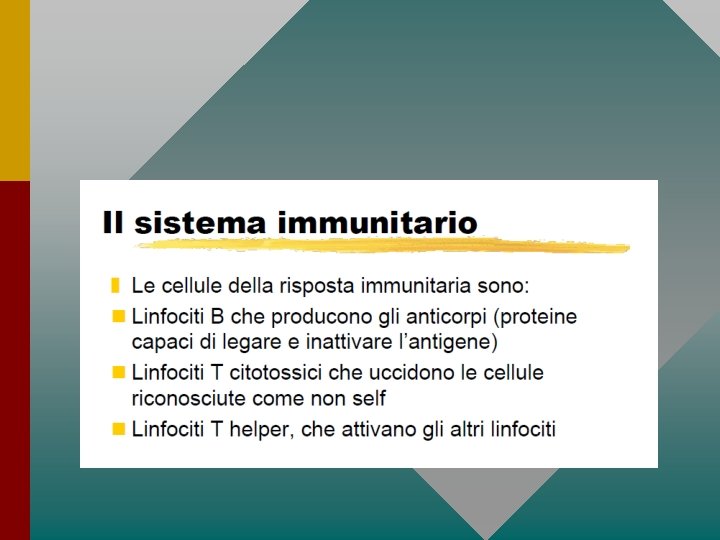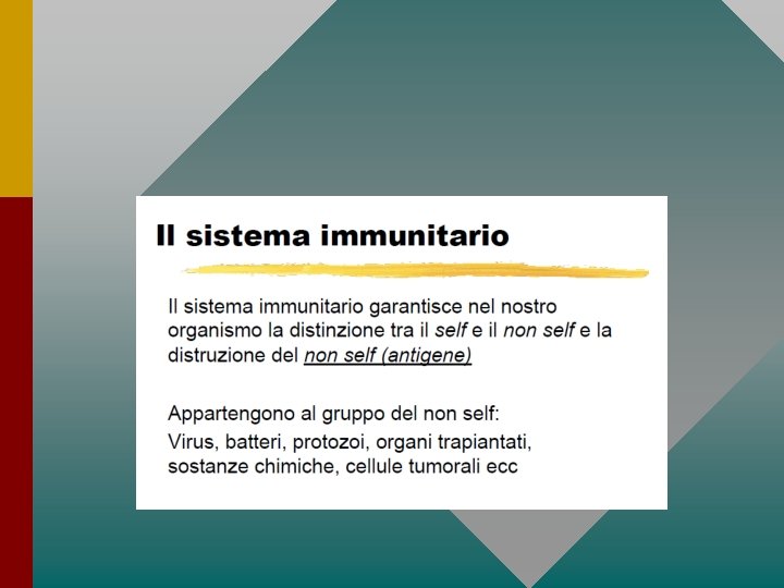 3 - IMMUNITA’ SPECIFICA • Acquisita : non presente alla nascita • Specifica: innescata dal riconoscimento di antigeni definiti • Adattativa: acquisita come adattamento a determinati stimoli • Selettiva: selettività di stimolazione e di azione