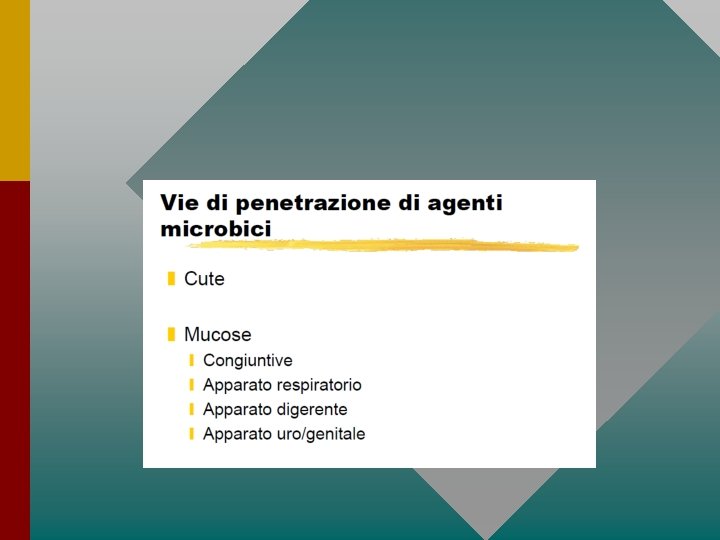 MECCANISMI DI DIFESA DELL’ORGANISMO • 1 - BARRIERE MECCANICHE E CHIMICHE: • bloccano ed eliminano i microrganismi nelle vie di accesso impedendo quindi che il contagio (contatto con agenti infettivi) sia seguito dall’infezione (moltiplicazione dei germi o replicazione intracellulare dei virus)
