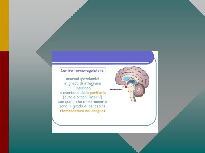 TERMOREGOLAZIONE 2 I centri termoregolatori, situati nel Sistema Nervoso Centrale (SNC), ricevono segnali termici sia locali (dati dalla temperatura del sangue) che dalla periferia attraverso i nervi sensitivi, le cui terminazioni periferiche (termocettori superficiali e profondi presenti in varie regioni dell’organismo) avvertono i gradi di temperatura con cui sono a contatto.