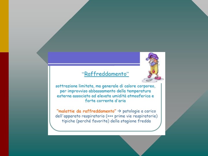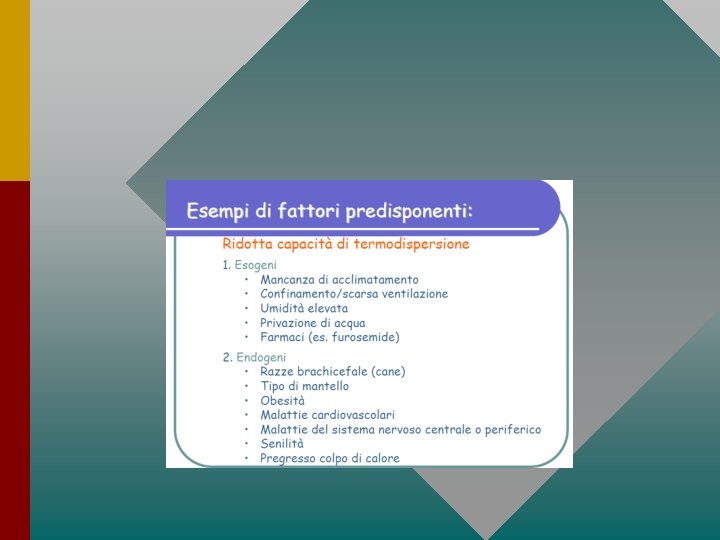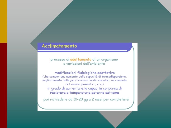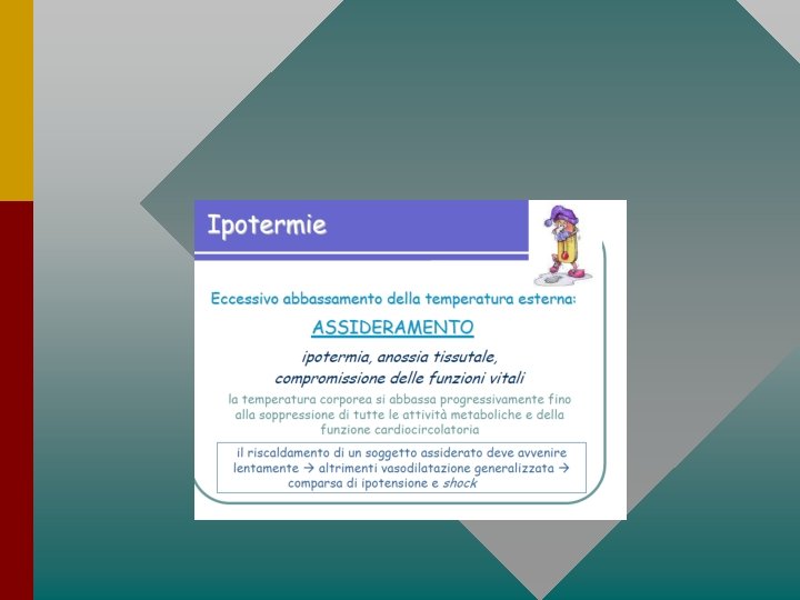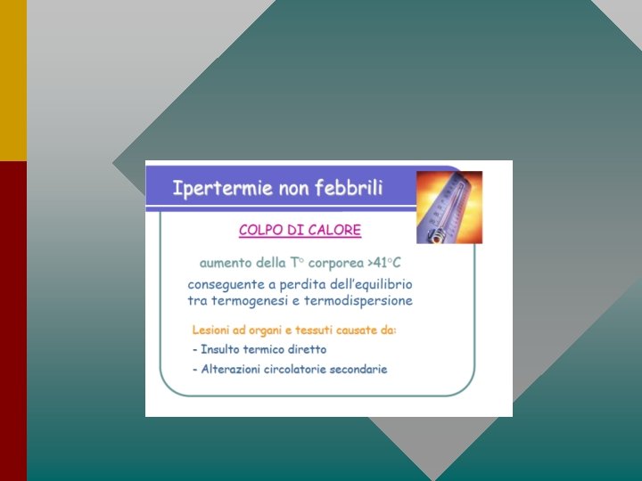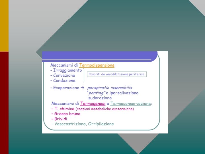 PER AUMENTARE LA TEMPERATURA CORPOREA Generazione di calore: - Produzione fisiologica di calore - Lavoro muscolare - Brividi Conservazione del calore: - Vasocostrizione - Ricerca ambienti caldi/riscaldamento