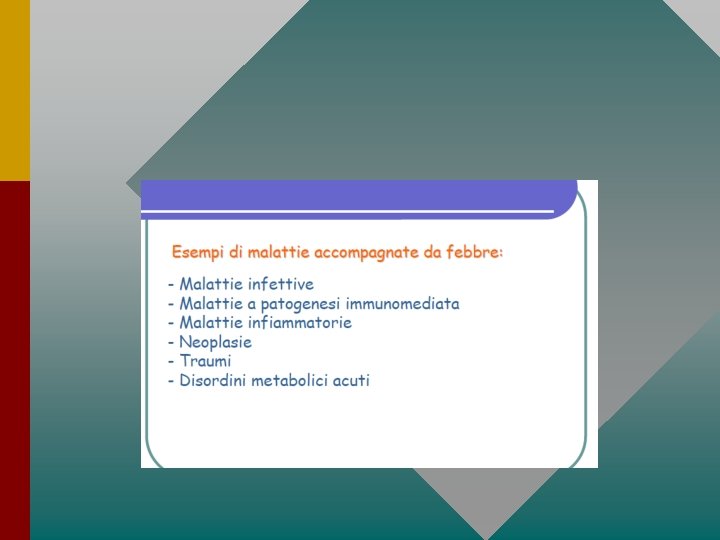 CAUSE DI FEBBRE Infezione Danno tissutale (infarto, trauma) Neoplasie Farmaci Malattie autoimmuni Altre malattie infiammatorie Endocrinopatie