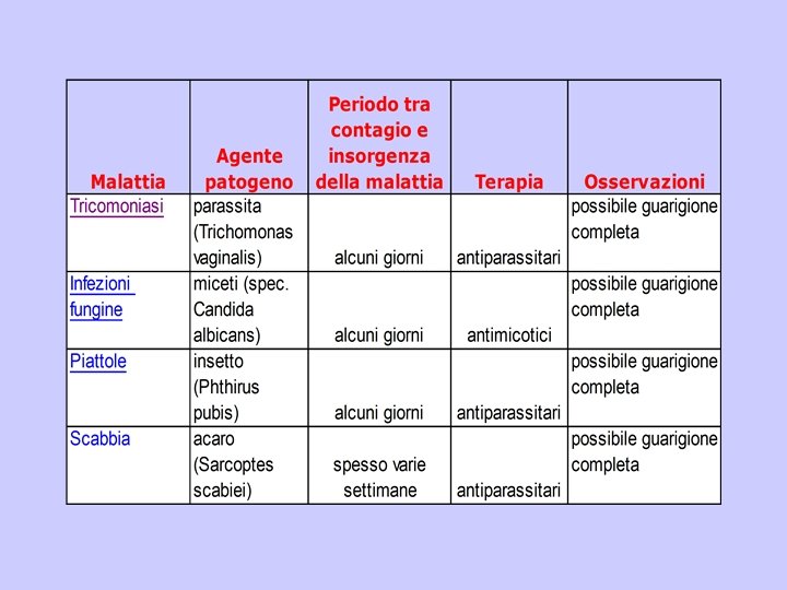 INFEZIONE DA PROTOZOI Ø Trichomonas vaginalis – vulvovaginite, cervicite, uretrite, balanopostite, prostatite Ø Entamoeba histolytica – amebiasi Ø Giardia lamblia – giardiasi INFEZIONE DA MICETI Ø Candida albicans – vulvovaginite, uretrite, balanopostite Ø Candida tropicalis Ø Candida pseudotropicalis Ø Candida krusei INFEZIONI DA ECTOPARASSITI Ø Phthirus pubis – pediculosi del pube Ø Sarcoptes scabiei – scabbia