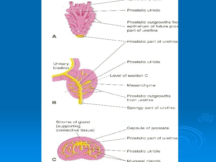 Prostate Ø Multiple endodermal outgrowths arise from the prostatic part of the urethra Ø Grow into surrounding mesenchyme Ø The glandular epithelium of the prostate differentiates from these endodermal cells Ø The associated mesenchyme differentiates into the dense stroma and smooth muscle of the prostate