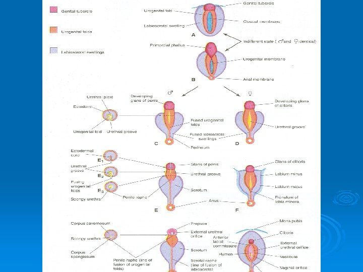 Development of Male External Genitalia Ø Masculization of the indifferent external genitalia is induced by testosterone Ø The phallus enlarges and elongates to become the penis Ø The urogenital folds form the lateral walls of the urethral groove on the ventral surface of the penis to form the spongy urethra