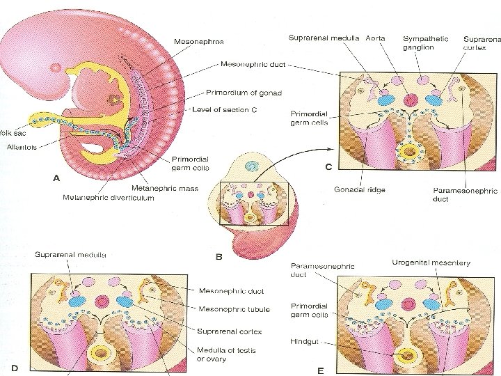 Primordial Germ Cells Ø These large, spherical cells are visible early in the fourth week among the endodermal cells of the yolk sac near the allantois Ø During folding of the embryo, the dorsal part of the yolk sac is incorporated into the embryo Ø With this the primordial germ cells migrate along the dorsal mesentery of the hindgut to the gonadal ridges Ø During the sixth week the primordial germ cells enter the underlying mesenchyme and are incorporated in the gonadal cords