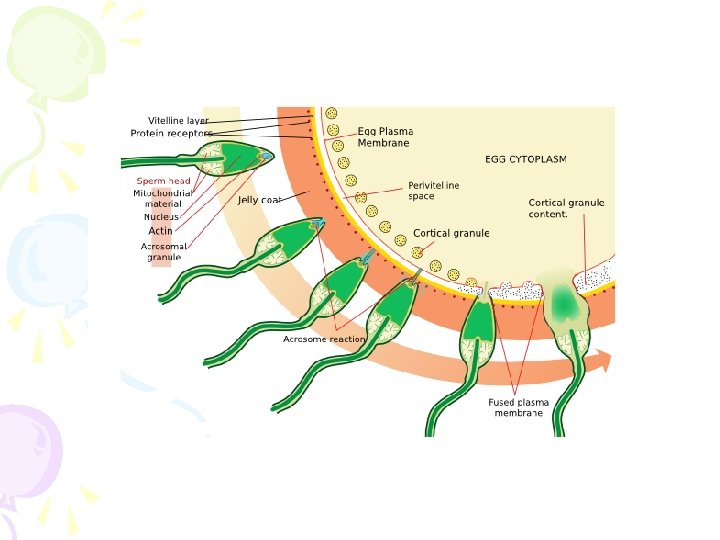 Fertilization • Middle of the female menstrual cycle, the cervical mucus changes • Acrosome reaction, zona reaction