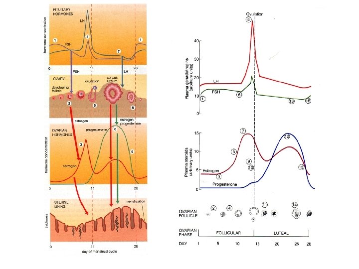 Stages of the Female Menstrual Cycle • The Follicle Stage: days 1 -14 (approximately) During this stage a hormone called FSH (follicle Stimulating Hormone) from the pituitary gland causes a follicle in the ovary to release the hormone estrogen • Estrogen: pregnancy causes the lining of the uterus to build up in blood supply and tom thicken in preparation for a • Ovulation-Day 14 During this stage a hormone called LH (luteinizing hormone)is released from the pituitary gland that causes the follicle to break open and release an egg