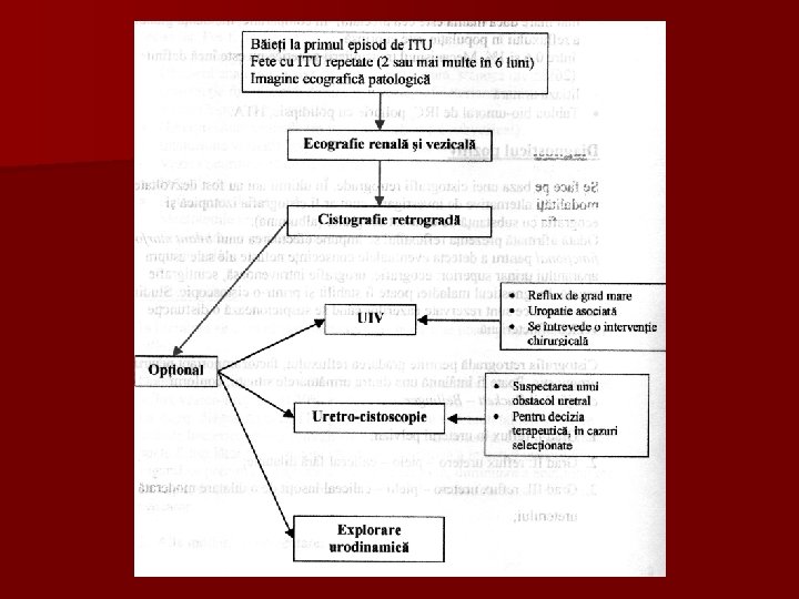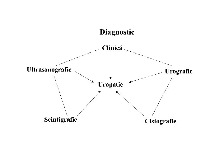 Investigaţii imagistice n Ecografia – – – Hidronefroză (prin dilataţie pelvicaliceală) Reducere indice parenchimatos Alţi indicatori ecografici § § § Hiperecogenitate Diferenţiere corticomedulară ştearsă Hipertrofie compensatorie contralaterală – Cistografie – absenţa refluxului vezicoureteral – Urografie iv. în administrare de furosemid – Explorarea radioizotopică – scintigrafia dinamică cu 99 TC – DTPA – Pielografie descendentă