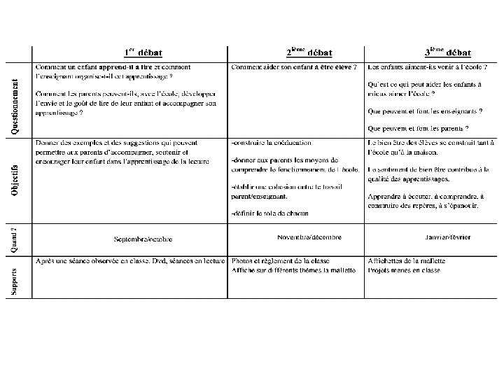 Les 3 débats Principes : • Les débats sont l’occasion d’échanges visant à créer un lien de confiance entre l’école et les parents. Objectifs : • Faire mieux connaître le fonctionnement de l’école et de l’équipe éducative • Créer un rapport de confiance avec les parents dans une dynamique de responsabilité partagée. • Expliciter, échanger, proposer.