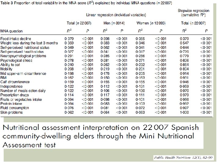 MNA �MNA short form with respect to the full MNA : sensitivity: 85. 2 %). The specificity: 88. 9%; positive predictive value possible undernutrition): 76, 4%; negative predictive value: 93, 4% �Undernutrition : 4, 3%; undernutrition risk is 25? 4 %, using the MNA test in two steps �BMI (kg/m 2) evidenced that 43? 0% of the studied sample was overweight and 30? 2% was obese, which suggests that not only undernutrition is important in the elderly popula- tion. Overweight rates in men and women were similar to the prevalence reported by Gutierrez -Fisac et al. (38) �women presented higher BMI values than men in contrast with the fact that women presented more undernutrition prevalence too, measured by the MNA test, � 9, 2% of the undernourished elderly, according to MNA criteria, presented BMI>= 30 � Food intake decline and weight loss during the last three months were the items that correlated better with the total MNA score. Cuervo M et al. Nutritional assessment interpretation on 22 007 Spanish community-dwelling elders through the Mini Nutritional Assessment test. Public Health Nutrition 2008; 12: 82– 90