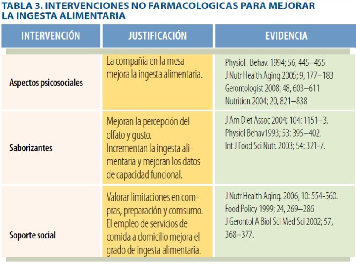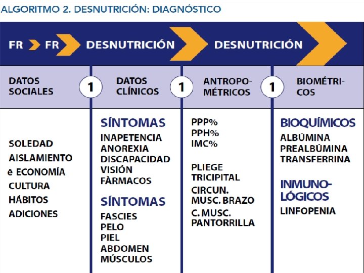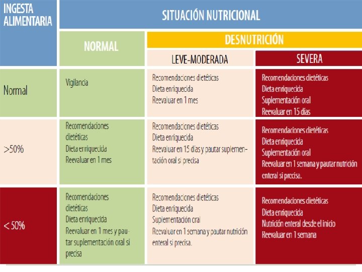PROPONEN MILÁ R ET AL. MED CLIN (BARC) 2012. �el uso de parámetros antropométricos y bioquímicos, y el MNA. �IMC: en entredicho por diferentes puntos de corte: >18, 5; <20; < 21 Kg/m 2. �MNA limitaciones: § la necesidad de obtener las medidas de talla y peso para calcular el IMC, § no es aplicable a personas con un estado de demencia avanzada. § método recomendado por la European Society of Parenteral and Enteral Nutrition. �registrar de forma sistemática y exhaustiva todos los factores pronósticos a tener en cuenta (capacidad funcional, física, cognitiva y enfermedades asociadas). Salva A, Coll-Planas L, Bruce S, De Groot L, Andrieu S, Abellan G. Nutritional assessment of residents in longterm care facilities (LTCFs): recommendations of the task force on nutrition and ageing of the IAGG European region and the IANA. J Nutr Health Aging. 2009; 13: 475– 83 .