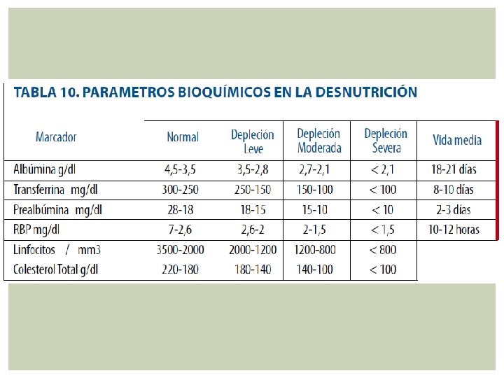 DEFINICIÓN MALNUTRICIÓN El término malnutrición fue descritos según los criterios del American Institute of Nutrition (AIN), que considera la presencia de cifras anormales en uno de los siguientes cuatro parámetros: (IMC, circunferencia braquial, niveles de albúmina y niveles de colesterol) como indicador de afectación del estado nutricional. No obstante, dado que otros indicadores antropométricos y analíticos están relacionados con la desnutrición calóricoproteica, se realizó un segundo cálculo añadiendo a los criterios del AIN los siguientes: cifra de linfocitos, determinación en sangre de transferrina y creatinina. �El criterio para considerar anormal : § § § IMC ≤ 20; Circunferencia braquial ≤ 21 cm; albúmina ≤ 3, 5 g/dl; colesterol ≤ 150 mg/dl; creatinina ≤ 0, 7 mg/dl; transferrina ≤ 200 mg/dl; linfocitos ≤ 1· 103 /u. L y creatinina ≤ 0, 7 mg/dl. Tarazona FJ et al. Validez de la escala MNA como factor de riesgo nutricional en pacientes geriátricos institucionalizados con deterioro cognitivo moderado y severo(Nutr Hosp. 2009; 24: 724 -731)