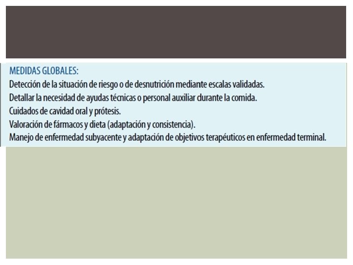 FACTORE RIESGO DESNUTRICION ENERGÉTICO-PROTEICA 9 “D”. • Demencia • Disgeusia • Disfagia • Diarrea • Depresión • Enfermedad • Dentición (Problemas en la ) • Deterioro funcional (Dysfunction) • Drugs (Fármacos)