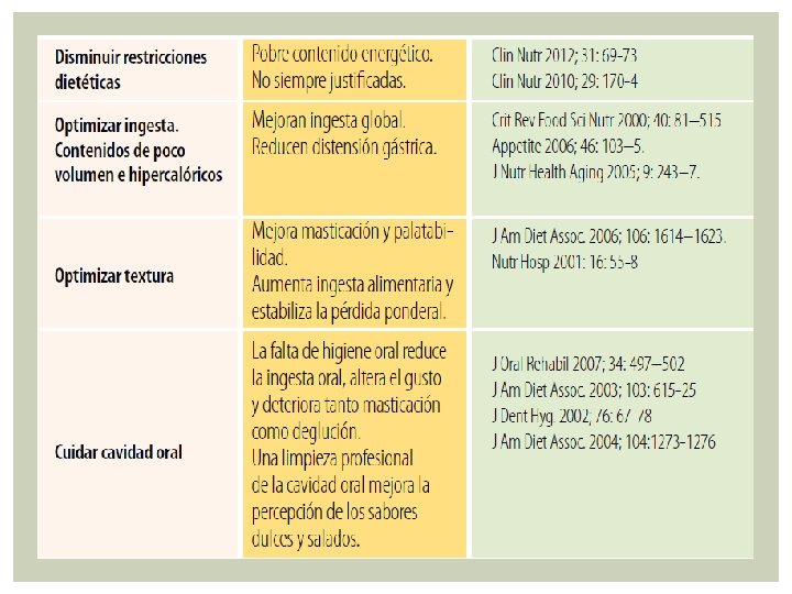 Lo que dicen que hay que tener en cuenta… �Rangos variables de IMC en según qué estudios(18, 5 -22) �Factores más comúnmente asociados a la pérdida de peso: �En todos los trabajos: § Depresion, Ingesta Inadecuada, problemas de masticación, problemas de Deglución, Dependencia para la alimentación. �En la mayoría de los trabajos: § Demencia, Dependencia funcional § Menor probabilidad de pérdida ponderal: Número de personal. Tamura BK, Bell C l, Masaki KH. Factors associated with weight loss low BMI, and malnutrition among nursing home patients: a systemic review of the literature. JAMDA 2013; 14: 649 -55.