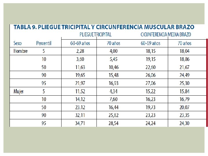 PLIEGUE TRICIPITAL (PT): �mide es la reserva grasa del organismo, �por lo que en los mayores presentará �cierto margen de error, ya que la mayoría �de la grasa, se acumula a nivel �abdominal y no a nivel subcutáneo. Percentil <5 = Desnutrición Grave, Percentil 5 -10 = Desnutrición Moderada y Percentil >85 = Sobrepeso.