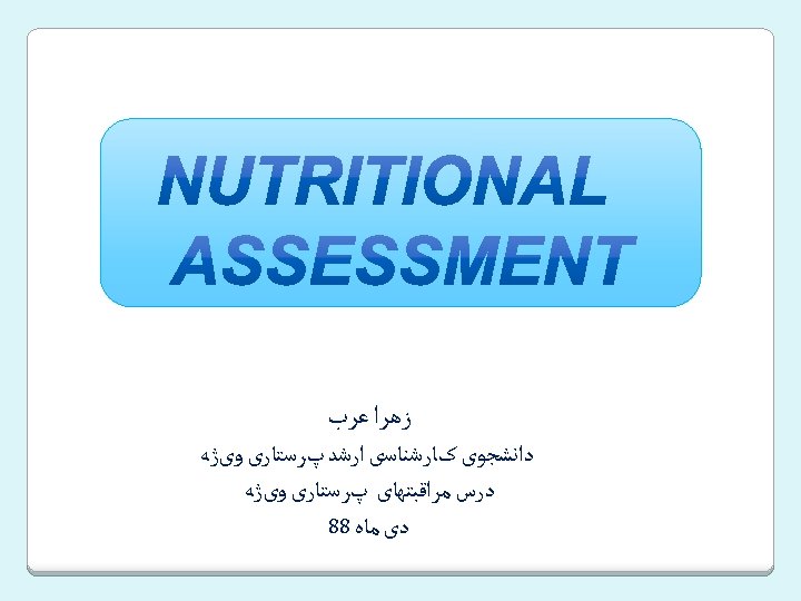 ☻Anthropometric measurements(daily weights, I&O) ☻ Biochemical evaluation(serum levels of BUN, electrolytes, BS, Ca, Ph, Alb, Tig, …) ☻ Physical examination